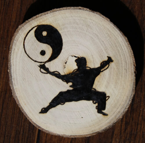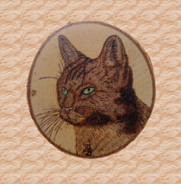 Katze auf Baumscheibe – ø ca. 8,5 cm (Feuerzeichnung + Buntstift)